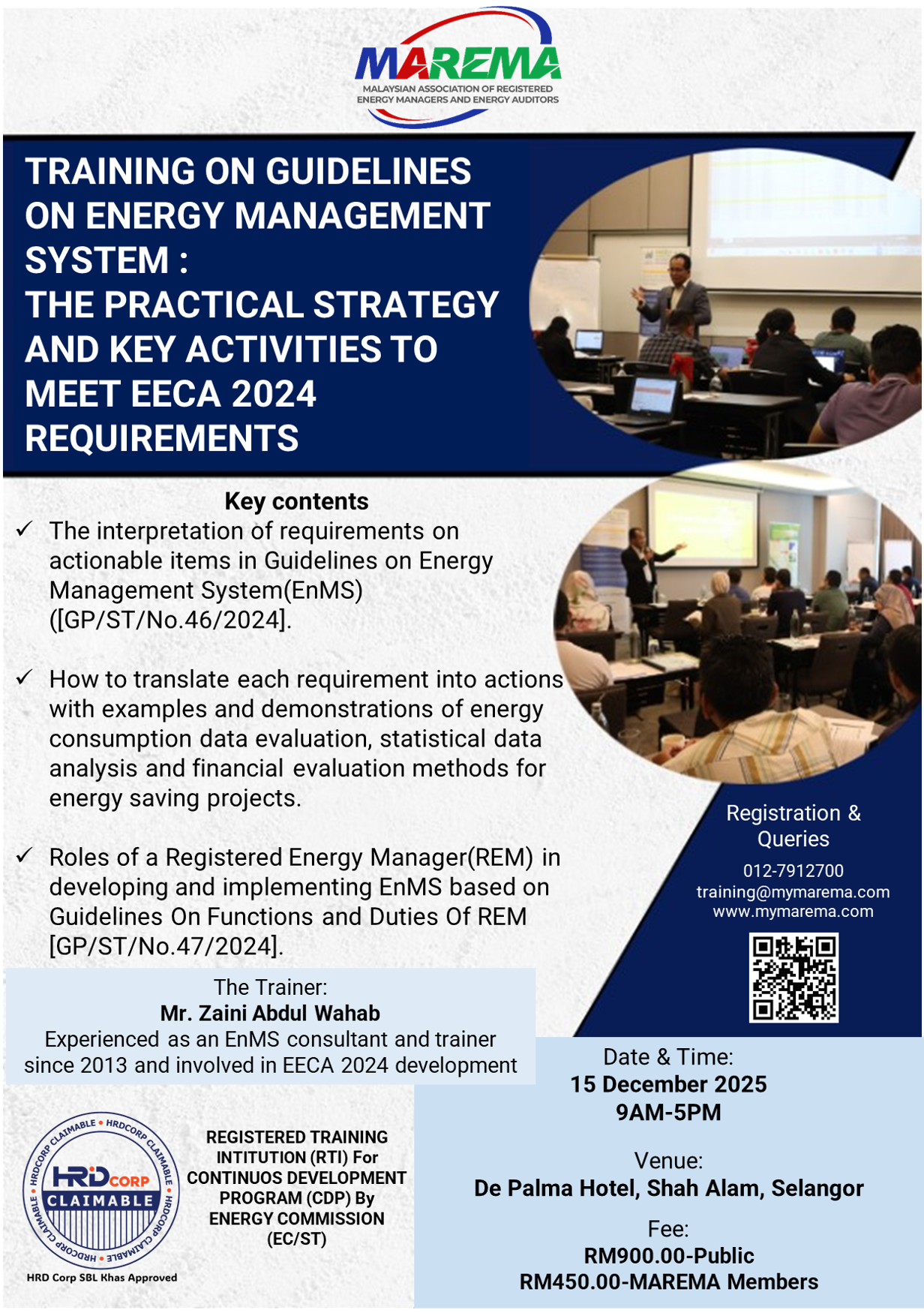 The one day training module designed to guide with examples for energy consumers and Registered Energy Managers to develop and implement energy management system based on Guideline on Energy Management System published by Suruhanjaya Tenaga (Energy Commission).